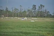 Bertie County emergency officials reported widespread catastrophic damage in the Askewville area, as 67 homes and 37 mobile homes were destroyed, with some homes ripped off their foundations. One business was also destroyed, and 19 other structures sustained lesser damage. There had also been some damage done to emergency vehicles as officials tried to clear the roadways in the damage path. The tornado destroyed seven mobile homes at Jake's Trailer Park, located off of Askewville Road, injuring two people.[43] This long-track tornado was the deadliest of the entire outbreak, killing 11 people (including a family of three and another couple) when the tornado hit areas a couple miles west of Colerain, and injuring 58 other people along its entire path.[44][45] On April 20, one of the injured people died at Pitt Memorial Hospital, increasing the death toll from the tornado to 12.[46] The tornado moved into Hertford County, damaging and destroying many more homes before dissipating at 7:10 p.m. EDT (23:10 UTC).[47] Another tornado touched down northwest of Colerain and tracked parallel to this tornado; it was rated EF2.[48]