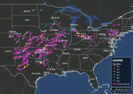 The final confirmed tornado total from this highly prolific outbreak sequence was 402, including 53 strong tornadoes and two violent tornadoes. Tornadoes were confirmed in 23 different states. On May 29, the U.S. had its 13th straight day with at least eight tornadoes, which broke the previous record of 11 days straight set in 1980.[3][4] On the day when the record was broken, the U.S. had an average of 27.5 tornadoes per day during the outbreak.[5] Only three days during this period did not see an EF3 tornado or stronger. An additional two tornadoes were also reported on May 30, after the streak officially ended.[4]