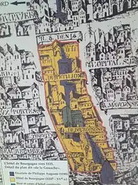 In 1369, the hôtel passed to Philip the Bold, the Duke of Burgundy, by his marriage to Marguerite, the Countess of Flanders and of Artois. The records of the concierge of the house show that between July 1371, and Easter 1375, he carried out important construction works, including the building of a tower.[5] After Philip's death in 1404, it became the property of Jean de Bourgogne, better known as Jean sans Peur, or John the Fearless.[2][3]