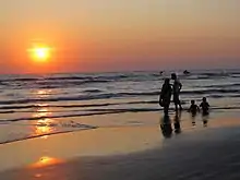 Kuakata is a sea beach on the southernmost tip of Bangladesh. Located in Patuakhali District, Kuakata has a wide sandy beach about 320 kilometres (200 mi) south of Dhaka, and about 70 kilometres (43 mi) from the district headquarters. Kuakata beach is 30 kilometres (19 mi) long and 6 kilometres (3.7 mi) wide. On the eastern end of the beach is Gongamati Reserved Forest, an evergreen mangrove forest and snippet of the original Kuakata. When the Rakhines settled in the area in 1784, Kuakata was part of the larger Sundarbans forest. Sundarbans is now at a distance of one-hour by speed boat. As a mangrove forest, Gongamati, like the Sundarbans, offers some protection against tidal surges, however it too is threatened by logging and deforestation. The forest can be reached by foot or bike along the beach.