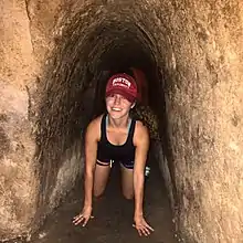 An American tourist crawling through the Cu Chi tunnels, constructed by the Viet Cong Guerrilla forces during the Vietnam War, now a popular tourist destination