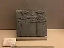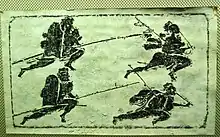 It's clear from surviving inventory lists in Gansu and Xinjiang that the crossbow was greatly favored by the Han dynasty. For example, in one batch of slips there are only two mentions of bows, but thirty mentions of crossbows.[36] Crossbows were mass-produced using material such as mulberry wood and brass; a crossbow in 1068 could pierce a tree at 140 paces.[37] Crossbows were used in numbers as large as 50,000 starting from the Qin dynasty and upwards of several hundred thousand during the Han.[38] According to one authority the crossbow had become "nothing less than the standard weapon of the Han armies" by the second century BC.[39] Han era carved stone images and paintings also contain images of horsemen wielding crossbows. Han soldiers were required to pull an "entry level" crossbow with a draw-weight of 76 kg/168lb to qualify as an entry level crossbowman,[40] while it was claimed that a few elite troops were capable of bending crossbows by the hands-and-feet method, with a draw-weight in excess of 340 kg/750lb.[41][42]
