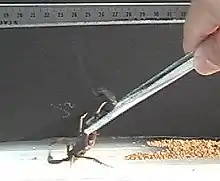 - ↑ Eisner, T., Meinwald, J., Monro, A. & Ghent, R. (1961). "Defence mechanisms of Arthropods. I. The composition and function of the spray of the whipscorpion, Mastigoproctus giganteus (Lucas)(Arachnida, Pedipalpida)". Journal of Insect Physiology 6, 272–298. doi:10.1016/0022-1910(61)90054-3.