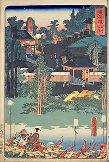 The temple was patronized in the Sengoku period by Imagawa Yoshimoto, Oda Nobunaga, Toyotomi Hideyoshi and Tokugawa Ieyasu, and by pilgrims from the merchant classes in the Edo period through the modern period.[9] Other notable devotees of Toyokawa Dakiniten include the Edo period magistrate and daimyō Ōoka Tadasuke, whose residence in Akasaka, Tokyo eventually became Toyokawa Inari's Tokyo branch temple, the painter Watanabe Kazan, and Prince Arisugawa Taruhito, who donated a framed sign (扁額, hengaku) in his own calligraphy of the words "Toyokawa Temple" (kyūjitai: 豐川閣, Toyokawa-kaku; shinjitai: 豊川閣).[9]