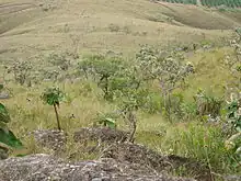 In areas of flattened topography in the mountains there are vegetation formations that characterize the altitude fields and, in the steepest regions, there are the rupestrian fields. These formations are characterized by the presence of a stratum consisting of low grasses, with thin and tough leaves, in addition to the presence of plants of the Cyperaceae and Eriocaulaceae families. In areas with quartzite outcroppings there are also colonies of Velloziaceae, Asteraceae, Malpighiaceae, Vochysiaceae, and Cactaceae. The first family (Velloziaceae) are the most notable in the area, especially on its south-southeast slope. During a certain season the plants produce purplish, red, yellow, or white flowers. Among other genera and species of plants that stand out in the highlands for the beauty and peculiarity of their flowers are Paepalanthus and Syngonanthus. The altitude fields are part of the Atlantic Forest, while the rupestrian fields belong to the Cerrado. The mountains therefore characterize a transition zone between these two biomes.[1]