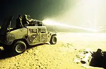 There are fireworks manuals from the 14th century specifying a way to make "flaming cannonballs," with pitch, gunpowder, a cloth/cordage cover, and finally smearing them with lard and tallow.[1] These were however not available for small arms, and before the development of tracers, gunners still relied on seeing their bullets impact to adjust their aim. However, these were not always visible, especially as the effective range of ammunition increased dramatically during the later half of the 19th century, meaning the bullets could impact a mile or more away in long range area fire. In the early 20th century, ammunition designers developed "spotlight" bullets, which would create a flash or smoke puff on impact to increase their visibility. However, these projectiles were deemed in violation of the Hague Conventions' prohibition of "exploding bullets."[2] This strategy was also useless when firing at aircraft, as there was nothing for the projectiles to hit if they missed the target. Designers also developed bullets that would trail white smoke. However, these designs required an excessive amount of mass loss to generate a satisfactory trail. The loss of mass en route to the target severely affected the bullet's ballistics.