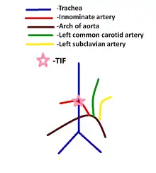 Tracheoinnominate fistula (TIAF or TIF) is an abnormal connection (fistula) between the innominate artery (brachiocephalic trunk or brachiocephalic artery) and the trachea. A TIF is a rare but life-threatening iatrogenic injury, usually the sequela of a tracheotomy.[1]