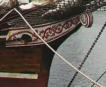 The bow of the German schooner SS Amphitrite, showing trailboards running from the billethead to the hawsepipe