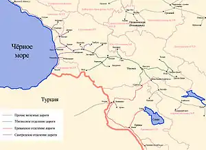 The railway started in 1865 at the port town of Poti on the Black Sea. The railway reached Zestafoni in 1871 and T'bilisi in 1872. The contractor for this part of the line was Messrs G.B. Crawley and Co.; the resident engineer was Edward Preston, C.E. who had previously been at work in North Wales.[2] This may account for the interest shown by this railway in Welsh mountain railways and narrow-gauge steam locomotives running on the north Wales Festiniog Railway.[3] A branch line was built to Kutaisi, branching from Brotseula, in 1877. In 1883 the railway was completed to Baku. Once the railway was completed to Baku, freight trains carrying oil went from Baku to Poti to be shipped to other cities in Russia via the Black Sea. During the Russian-Ottoman war from 1877–1878, the Russian Empire gained territory into Anatolia from the Ottoman Empire after defeating them during the Battle of Kars. This new territory included the fortress city of Kars. In 1887 a branch line was built to Tkibuli. In 1894 a branch line, splitting of at Khashuri, was built to Borjomi. Kars was a strategic city for the Russians in Anatolia, so in 1899 the railway built a branch line from T'blisi to Kars. The Transcaucasus Railway was connected to the rest of the Russian system in 1900, when the line from Baku to Makhachkala was completed. In 1902, the narrow gauge Borjomi to Bakuriani Railway was built to serve the skiing community in the region. In 1913 the railway was extended from Kars to Sarıkamış; the border of the Russian Empire and the Ottoman Empire at the time. When World War I broke out in 1914, the Russian Empire sided with the Allied powers while the Ottoman Empire sided with the Central Powers making the two empires enemies. After the Erzerum Offensive, Russia gained control city of Erzurum. To support campaigns further into Ottoman territory, a 750 mm (2 ft 5+1⁄2 in) gauge railway was built from Sarıkamış to Erzurum in 1916 and extended to Yeniköy later the same year. Russia had to stop fighting in the war because of the Russian revolution of 1917, that led to the dissolution of the Russian Empire.