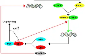 - ↑ Brown SA, Kowalska E, Dallmann R (March 2012). "(Re)inventing the circadian feedback loop". Developmental Cell. 22 (3): 477–87. doi:10.1016/j.devcel.2012.02.007. PMID 22421040.