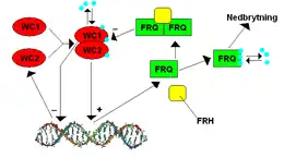 The gene frequency (frq) in Neurospora was identified as the second known clock gene in 1979 by JF Feldman and his colleagues. Frq was first cloned in 1989 by CR McClung and his colleagues. This gene was of particular interest because its expression is very complex compared to other known microbial genes. Two positive regulator proteins, White Collar-1 (WC-1) and White Collar-2 (WC-2) bind the frq promoter, which is called the Clock Box, during late subjective night to activate transcription. Light is also important for inducing FRQ expression; WC-1 is a photopigment, and light allows WC-1 and WC-2 to bind another promoter called the proximal light-response element (PLRE). FRQ protein negatively regulates the activity of WC-1 and WC-2. Several kinases (CK1, CK2, and PRD-4/checkpoint kinase 2) and phosphatases (PP1 and PP2A) regulate the ability of FRQ to translocate to the nucleus and FRQ, WC-1 and WC-2 stability.[9]