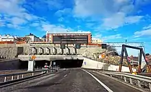 A road is an identifiable route, way, or path between two or more places.[5] Roads are typically smoothed, paved, or otherwise prepared to allow easy travel;[6] though they need not be, and historically many roads were simply recognizable routes without any formal construction or maintenance.[7] In urban areas, roads may pass through a city or village and be named as streets, serving a dual function as urban space easement and route.[8]