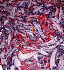 Regardless of the ecological effects of trawling, the cost of bycatch as trawlers operate poses an economic issue. It is estimated by Oceana that, worldwide, fishermen lose at least $1 billion worth of potential catch annually due to the disposal of bycatch.[17] Any animal that is caught and discarded as bycatch often dies and cannot reproduce, negatively impacting the stock of the species.[16] Bycatch is not limited to only inexpensive species of fish. Often, well known and prized fish species are disposed of as bycatch due to size and sex restrictions or because the vessel's permit does not include the species. The highest cost associated with the bycatch of a single species is Pacific Halibut worth an annual $58.7 million. For halibut the massive bycatch cost can be attributed to trawlers catching more halibut as bycatch than the halibut fishery catches total. In 2014 seven times as many halibut were caught and discarded as trawl bycatch then in the directed fishery.[18] Additionally, other prized fish species have an immense bycatch cost, the most costly are Seatrout worth $45.5 million, Atlantic sea scallop worth $32.7 million, red snapper worth $27.2 million, summer flounder worth $7.2 million, red grouper worth $6.7 million, Atlantic and Pacific cod worth $6.7 million, Tanner crab worth $4.6 million, king mackerel worth $4.3 million, sole worth $3.9 million, bluefin tuna worth $3.4 million, Chinook (king) salmon worth $1.4 million, and swordfish worth $1.3 million.[17] The aforementioned estimates were determined using the wholesale market price that fishing vessels sell their fish to processors for, which is often cents on the dollar compared to the price at a store and were determined using bycatch reports from observed vessels, which have a dedicated observer to estimate the amount of bycatch a vessel captures and could be less than the true values.