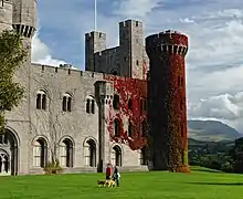 The Great Parlor, the house's focal point, contains Edward Burne-Jones's 1894 painting Love Among the Ruins.[101] Charles Eamer Kempe decorated the room's ceiling in the "Medieval manner" and painted a plaster frieze just below, a frieze inspired by that of Hardwick Hall.[102]