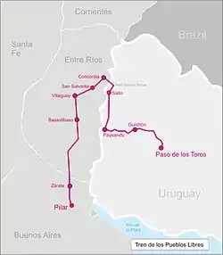 The Tren de los Pueblos Libres ("Train of the Free Peoples") was an 813-km length rural railway line that connected Argentina and Uruguay, being operated by both the Argentine private company Trenes de Buenos Aires (TBA) on General Urquiza Railway standard gauge rail tracks, and Uruguayan the State-owned State Railways Administration of Uruguay "Administración de Ferrocarriles del Estado" (AFE).
