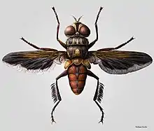 Trichopoda pennipes can reach a length of 10.5 millimetres (0.41 in),[13] about the size of a large housefly. These medium-sized flies have a velvety, black head. The black or brown thorax shows a few yellow stripes. Eyes are large, brown with yellow between. The color of the slender abdomen varies from bright orange to completely black. Females usually have a dark-tipped abdomen, while males have a dark orange apex. Wings are transparent, smoky with prominent veins. In the females they are evenly dusky, with the posterior margin sub-hyaline. Male flies have a ferrugineous marking on the wings. This fly has huge halteres. Legs are black, with yellow feet. The hind legs bear a prominent feather-like fringe of flattened hairs.[9][12]