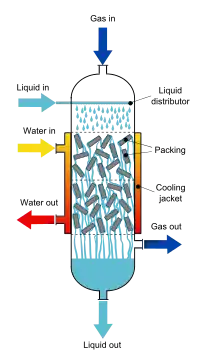 A trickle-bed reactor (TBR) is a chemical reactor that uses the downward movement of a liquid and the downward (co-current) or upward (counter-current) movement of gas over a packed bed of (catalyst) particles. It is considered to be the simplest reactor type for performing catalytic reactions where a gas and liquid (normally both reagents) are present in the reactor and accordingly it is extensively used in processing plants. Typical examples are liquid-phase hydrogenation, hydrodesulfurization, and hydrodenitrogenation in refineries (three phase hydrotreater) and oxidation of harmful chemical compounds in wastewater streams or of cumene in the cumene process.[1][2][3]