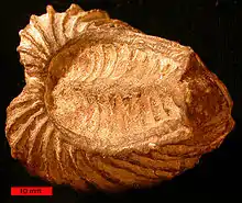 | Trigonia sp. (Cretaceous) near Austin, Texas. Scale bar is 10 mm. | |