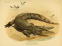 The story that the trochilus cleans the mouth of the crocodile is considered a fable, but many travellers and naturalists have been reluctant to reject it, and there have been attempts to identify the trochilus with several species of plover, lapwing and sandpiper, and to explain its curious behaviour.[10] Leo Africanus mentions the story uncritically in his Description of Africa.[11] Topsell says that the crocodile reopens its mouth because the bird carries sharp thorns on its head which prick the crocodile's palate, and Andrew Leith Adams says that the reminder is conveyed to the crocodile by the horny spurs of the bird, which Alfred Brehm identified as the Egyptian plover.[7][12]