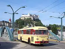 The oldest operable trolleybus in Salzburg is a 1957 model ÜHIIIs. This is not an original Salzburg vehicle; with the fictitious number 123, it comes from the Solingen trolleybus system (former number 40) and has been loaned by an English collector.