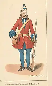 The Troupes de la Marine (Troops of the French Navy) was a military body founded by Cardinal Richelieu in 1622 under the denomination of Compagnies Ordinaires de la Mer, were originally intended to form the garrisons of the ships of the King. It was in 1674 that Jean-Baptiste Colbert decided to make permanent colonial troops and give them the name of Compagnies Franches de la Marine.[1]