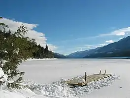 Trout Lake is a ribbon lake in the West Kootenay region of southeastern British Columbia. Between the Selkirk Mountains to the west and the Purcell Mountains to the east, the lake is about 23 kilometres (14 mi) long and 1.6 kilometres (1 mi) wide. Lardeau Creek flows into the northern end and Lardeau River flows from the southern end.[1] BC Highway 31 skirts the northeast shore. The northern end is about 90 kilometres (56 mi) by road and ferry southeast of Revelstoke.
