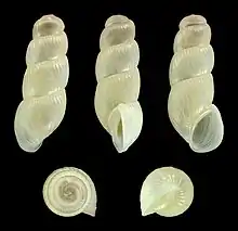 Truncatella caribaeensis is a species of a very small somewhat amphibious land snail with a gill and an operculum, a semi-terrestrial gastropod mollusk or micromollusk in the family Truncatellidae, the truncatella snails or looping snails. These tiny snails live in damp habitat (under rotting vegetation) that is very close to the edge of the sea; they can tolerate being washed with saltwater during especially high tides. These snails are sometimes listed as land snails and at other times they are listed as marine snails.[1]