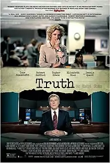 Truth is a 2015 American biographical political drama film written and directed by James Vanderbilt in his directorial debut. It is based on American television news producer Mary Mapes's memoir Truth and Duty: The Press, the President and the Privilege of Power. The film focuses on the Killian documents controversy and the resulting last days of news anchor Dan Rather and producer Mary Mapes at CBS News. It stars Cate Blanchett as Mapes and Robert Redford as Rather.