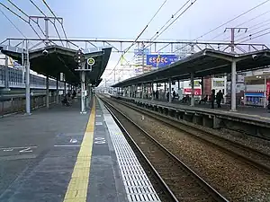 This station has two elevated island platforms with four tracks. Tracks 1 and 4 are fenced as all trains running on the outer tracks pass through this station without stopping.