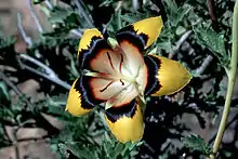 Turnera oculata is an evergreen, woody shrub, bearing striking yellow flowers with a dark centre, and occurring in the Kaokoveld in the Namib Desert in northern Namibia and in southern Angola. It is one of some 130 species occurring mainly in South America, but with two species found in Africa - one in Namibia and Angola, and the other in tropical Africa.