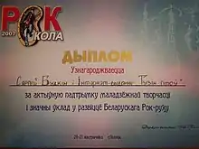 Rock-kola-2007's Certificate "For Active Support of Youth Creativity and a Significant Contribution to the Development of the Belarusian Rock Movement" - Tuzin. Perazagruzka (The "Rock Coronation Awards 2009," "Project of the Year")[36]