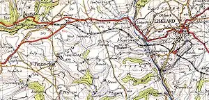 The A38 trunk road ran through the village until the bypass was opened on 19 December 2008.[2][3] The bypass has two of the most elaborate bat bridges built so far in the UK (previous examples in Wales being wooden posts with cables).[4] Twelve native species of bats are found in the area.[5]