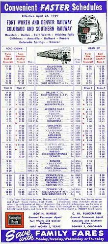 A fold-out Chicago, Burlington & Quincy Railroad schedule from 1959 shows the Twin Star Rocket schedule south of Fort Worth.