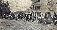 Robert Twyford, to demonstrate the pulling power of the cars, on July 12, 1905, drove a 9 hp runabout down Main Street in Brookville. As shown in Figure 6, he fitted the rear-wheels to a wooden frame, using castors, which showed that he could drive the car with only the front-wheels. Then, as shown in Figure 7, with the frame removed, he towed two carriages containing five passengers up a 14.5 percent grade. The picture shows Robert Twyford at the steering wheel, with his foreman, Mr. Ralph Reitz, beside him. Figure 8 also demonstrates the Twyford's towing power. But, the demonstration involved a specially prepared runabout. Robert Twyford had the machine geared down for maximum power at the expense of high speed. The car, as prepared, only had a maximum speed of 9 mph.