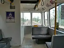 The prototype cars are very similar to the production fleet, with the exception of having Kiekert passenger doors, which were refitted to match the specification of the production fleet before entering passenger service. The prototype cars were also fitted with two different types of block coupling equipment (one at each end), allowing the two designs to be thoroughly tested. The prototypes featured small cabs and central end doors similar to London Underground stock, to allow evacuation of trains in a tunnel. In the event, the Metro tunnels were constructed with continuous sidewalks, making the end doors unnecessary. Prior to their entry into service in 1987, the two prototypes were refitted to reflect the specification of the production fleet.[11] The small cabs remained in the series vehicles with a passenger seat beside offering a forward view.