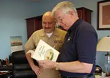 ![]() Martin (right) autographs a copy of A Most Fortunate Ship for Commander William A. Bullard III, May 2007 | |