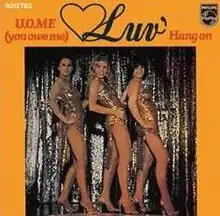 U.O.Me is the third single by the Dutch girl group Luv', released in early 1978 by Philips Records. It appears on the 1978 debut album, With Luv' and is considered as Luv's real breakthrough in Benelux. This record is also credited as U.O.Me (You Owe Me), U.O.Me (Welcome to Waldolala) or U.O.Me (Theme from Waldolala).