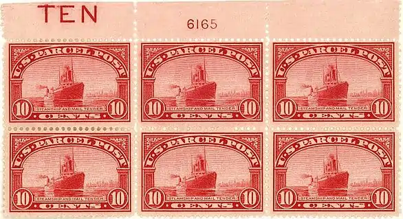 Before 1912 the delivery of parcels was controlled and handled by private companies, most of whom operated in cities and urban areas, where most of the business existed. Consequently, delivery of parcels to rural areas was inadequate and frequently hindered farmers who needed various supplies, parts and equipment delivered to their remote locations. To meet this demand Congress approved a law on August 24, 1912, creating postal rates for fourth class mail and providing for parcel post service. The Congressional law authorized the U.S. Post Office to produce the various special purpose postage stamps to pay the parcel fees, which became effective on January 1, 1913, the first day the U.S. Parcel Post began service.[1] The 12 stamps were printed by the Bureau of Engraving and Printing on the flat plate printing press on soft yellowish wove paper made with a single-line watermark bearing the letters 'U S P S' and were perforated with 12 gauge perforations.[2][3] The stamps were designed by Clair Aubrey Huston who at the time had worked at the Bureau for ten years,[4] while the dies for the individual stamps were produced by several different engravers, with up to four engravers working on each die.[5] The Post Office initially planned to place all dozen stamps on sale before parcel post service began, but Frank Hitchcock, the Postmaster General, deemed the original designs for the 3-cent, 50-cent and 75-cent denominations unsatisfactory, delaying the issue of those values until after the first of the year.[6] The twelve stamps each bore their own distinctive subject in the vignette and were issued in a single color, "carmine-rose".[7] It was Hitchcock who came up with the idea of printing all the denominations of these stamps in one uniform color.[8] However, because of the common color and similarity in border design Parcel Post stamps during the first six months of use were met with mixed reaction from postal personnel who had difficulty distinguishing the stamps at a glance and often confused the denominations, especially during busy hours.[7][8] "In an effort to help the stamp clerks an inscription of value in large plain capital letters was added to the [sheet] margin, next to each plate number. These were first added to plates on January 27, 1913."[6] An example of these large red spelled-out numbers, which appeared on two margins of each pane, can be seen on the illustration of the ten-cent plate block in the section "Other configurations" further down this page.