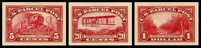 Special stamps were printed for Parcel Post service to help in the effort of keeping accounts and revenues generated from general postage and the Parcel Post separate.[10] The twelve Parcel Post stamps had three basic design themes that were associated with the Post Office and its delivery service.[5] The denominations were such that any amount of postage up to one dollar could be made by using no more than three stamps.[10] Three of the Parcel Post denominations—20 cents, 25 cents and 75 cents—were new to U. S. Postage.