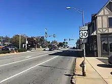 US 30 enters Chester County and continues east along Lincoln Highway, passing through Black Horse. The route turns into a four-lane undivided road and comes to an intersection with PA 10 north of Parkesburg, where it becomes a divided highway. US 30 splits from Lincoln Highway at an eastbound exit and westbound entrance by heading onto a four-lane freeway called the Coatesville Downingtown Bypass, with US 30 Bus. continuing east along Lincoln Highway. The freeway heads east, crossing Buck Run and coming to a westbound exit and eastbound entrance with Airport Road that provides access to Chester County G. O. Carlson Airport. Following this, the route runs east-northeast through a mix of rural areas and suburban development. US 30 heads into Coatesville and crosses the West Branch Brandywine Creek before it comes to a partial cloverleaf interchange with PA 82 that provides access to Coatesville. Past this interchange, the freeway leaves Coatesville and passes under PA 340 before reaching an interchange with Reeceville Road. The route curves east-southeast and crosses under PA 340 again before running east and coming to a diamond interchange with PA 340 north of Thorndale. US 30 heads east-northeast and reaches a partial cloverleaf interchange with US 322 that serves Downingtown. Farther east, the freeway passes over PA 282 and the East Branch Brandywine Creek before it comes to a bridge over the Struble Trail and enters a section of Downingtown, reaching a westbound exit and eastbound entrance with Norwood Road that provides access to PA 282. The route widens to six lanes and heads near suburban development before it comes to an eastbound exit and westbound entrance with PA 113, at which point it leaves Downingtown and narrows back to four lanes. US 30 curves southeast and reaches an interchange with US 30 Bus. Past this interchange, the name of the freeway changes to Exton Bypass. The route turns northeast and runs parallel to Amtrak's Keystone Corridor railroad line to the south of the road. US 30 comes to a partial cloverleaf interchange with PA 100 that serves Exton to the north. Following this, the freeway continues east-northeast parallel to the Amtrak line. US 30 comes to an interchange with the US 202 freeway and the eastern terminus of US 30 Bus., at which point the freeway section ends.[2][3] The Exton Bypass portion of US 30 is designated the Exton Bypass Scenic Byway, a Pennsylvania Scenic Byway.[6]