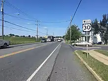 Past the interchange with the eastern terminus of PA 462, US 30 heads east-southeast along Lincoln Highway, a five-lane road with a center left-turn lane, passing through Greenland.[2][3] The route heads into the Pennsylvania Dutch Country of eastern Lancaster County and is lined with many Amish tourist attractions.[4][5] The road crosses Mill Creek and heads north of the Tanger Outlets Lancaster outlet mall and south of the Dutch Wonderland amusement park. US 30 passes south of the American Music Theatre and runs between two shopping centers before it reaches an intersection with PA 896. Past this intersection, the route narrows to a three-lane road with a center left-turn lane and heads through agricultural areas with some development, passing through Soudersburg. US 30 crosses the Pequea Creek and runs through Paradise before it comes to a bridge over Amtrak's Keystone Corridor railroad line. From here, the route continues east-southeast a short distance to the north of the Amtrak line. The road closely parallels the railroad tracks as it heads through Kinzers. The Amtrak line diverges to the south east of here. The route splits into a one-way pair, with two lanes in each direction, as it reaches Gap and comes to an intersection with the eastern terminus of PA 772. US 30 continues along the one-way pair, with both directions rejoining at a junction with the northern terminus of PA 41. Past the PA 41 junction, the route is a four-lane divided highway that soon turns into a three-lane road with a center left-turn lane, intersecting the southern terminus of PA 897. The road leaves Gap and turns into a three-lane road two eastbound lanes and one westbound lane as it ascends a hill. Farther east, the route becomes three lanes with a center left-turn lane.[2][3]