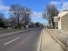 Upon intersecting Old Eagle School Road/Sugartown Road, US 30 enters Delaware County and continues east-southeast along four-lane undivided Lancaster Avenue, curving east and running through the downtown area of Wayne. The route passes through St. Davids and turns southeast. East of here, the road becomes a divided highway before turning undivided again. US 30 briefly becomes a divided highway again as it curves east and reaches an interchange with I-476. Past this interchange, the route turns back into an undivided road and crosses under SEPTA's Norristown High Speed Line before coming to an intersection with PA 320 in Villanova. Following this intersection, the road runs through the Villanova University campus, passing south of St. Thomas of Villanova Church, and curves southeast prior to the Ithan Avenue intersection, where it heads to the south of Villanova Stadium and the Finneran Pavilion arena. After passing through the university campus, US 30 runs through Rosemont. Upon intersecting County Line Road, the route enters Montgomery County and heads into Bryn Mawr, passing through the downtown area. The road continues southeast and briefly re-enters Delaware County before heading back into Montgomery County. US 30 passes through Haverford, where it heads north of the Haverford School. The route continues into Ardmore and runs through the downtown area, passing south of the Ardmore station serving Amtrak's Keystone Corridor and SEPTA's Paoli/Thorndale Line. Past Ardmore, the road heads through Wynnewood. The route runs southeast before it crosses the East Branch Indian Creek and passes between the St. Charles Borromeo Seminary to the northeast and Lankenau Medical Center to the southwest as a five-lane road with a center left-turn lane prior to reaching an intersection with US 1 (City Avenue).[2][3]