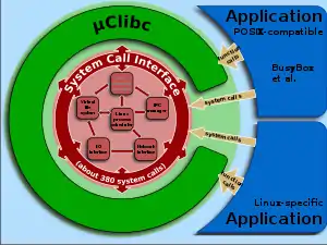 uClibc is a wrapper around the system calls of the Linux kernel and μClinux.
