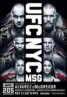 UFC 205: Alvarez vs. McGregor was a mixed martial arts event promoted by the Ultimate Fighting Championship held on November 12, 2016, at Madison Square Garden in New York City, New York.[3]