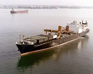 In 1984, she was acquired and chartered by the Navy under a long-term contract. The ship underwent conversion at the National Steel and Shipbuilding, San Diego until October 1984.[3] Later that year, put into service as SS Sgt. Matej Kocak (AK-3005).[5] Sgt. Matej Kocak was put into the Maritime Prepositioning Ship Squadron 2, based at Diego Garcia in the Indian Ocean to support the US Marine Corps Expeditionary Brigade.[5][4]