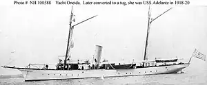 - ↑ "Photo #: NH 100571 Adelante (American Tug, ex-Yacht, 1883)". Naval History And Heritage Command (Archived page no longer at NHHC at ibiblo.org). 28 April 2002. Retrieved 19 September 2018.
