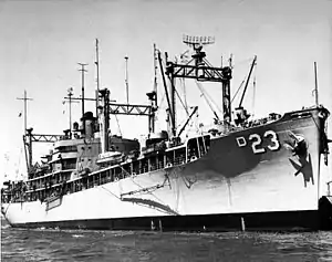 USS Arcadia was one of four Klondike-class destroyer tenders built at the tail end of World War II for the United States Navy, and the third U.S. Naval vessel to bear that name. Destroyer tenders were typically named after U.S. National Parks. However the destroyer tender AD-23 was apparently misnamed Arcadia in an effort to commemorate Acadia National Park in Maine.