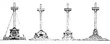 The first memorial to the Maine dead was constructed in the first six months of 1900.[92] Near the field of the Maine dead a concrete base was poured. Two Spanish mortars – taken by Admiral George Dewey from Cavite Arsenal in Manila, The Philippines, at the end of the Spanish–American War—were placed on brick piers on either side of this base.[93]