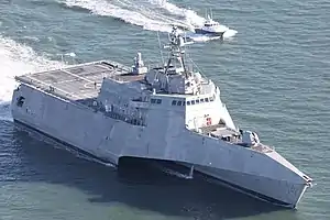 In 2002, the United States Navy initiated a program to develop the first of a fleet of littoral combat ships.[9] The Navy initially ordered two trimaran hulled ships from General Dynamics, which became known as the Independence-class littoral combat ship after the first ship of the class, USS Independence.[9] Even-numbered U.S. Navy littoral combat ships are built using the Independence-class trimaran design, while odd-numbered ships are based on a competing design, the conventional monohull Freedom-class littoral combat ship.[9] The initial order of littoral combat ships involved a total of four ships, including two of the Independence-class design.[9] On 29 December 2010, the Navy announced that it was awarding Austal USA a contract to build ten additional Independence-class littoral combat ships.[10][11]