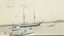 As part of celebrations for the centennial of the Battle of Lake Erie, Niagara was raised from Misery Bay in April 1913. Its keel was found to be in good enough condition for the brig to be rebuilt. Efforts to rebuild Niagara were hampered by the lack of original plans.[33] The restored Niagara was launched on 7 June, complete with a new bowsprit, rigging and reproduction cannons supplied by the Boston Navy Yard.[33][34] From mid-July to mid-September, Niagara was towed to various ports on the Great Lakes—including Milwaukee, Chicago, Detroit, Buffalo and Cleveland—by USS Wolverine, the Navy's first iron-hulled warship.[35][36] Ownership of Niagara was transferred to the City of Erie in 1917, where it remained docked and deteriorating.